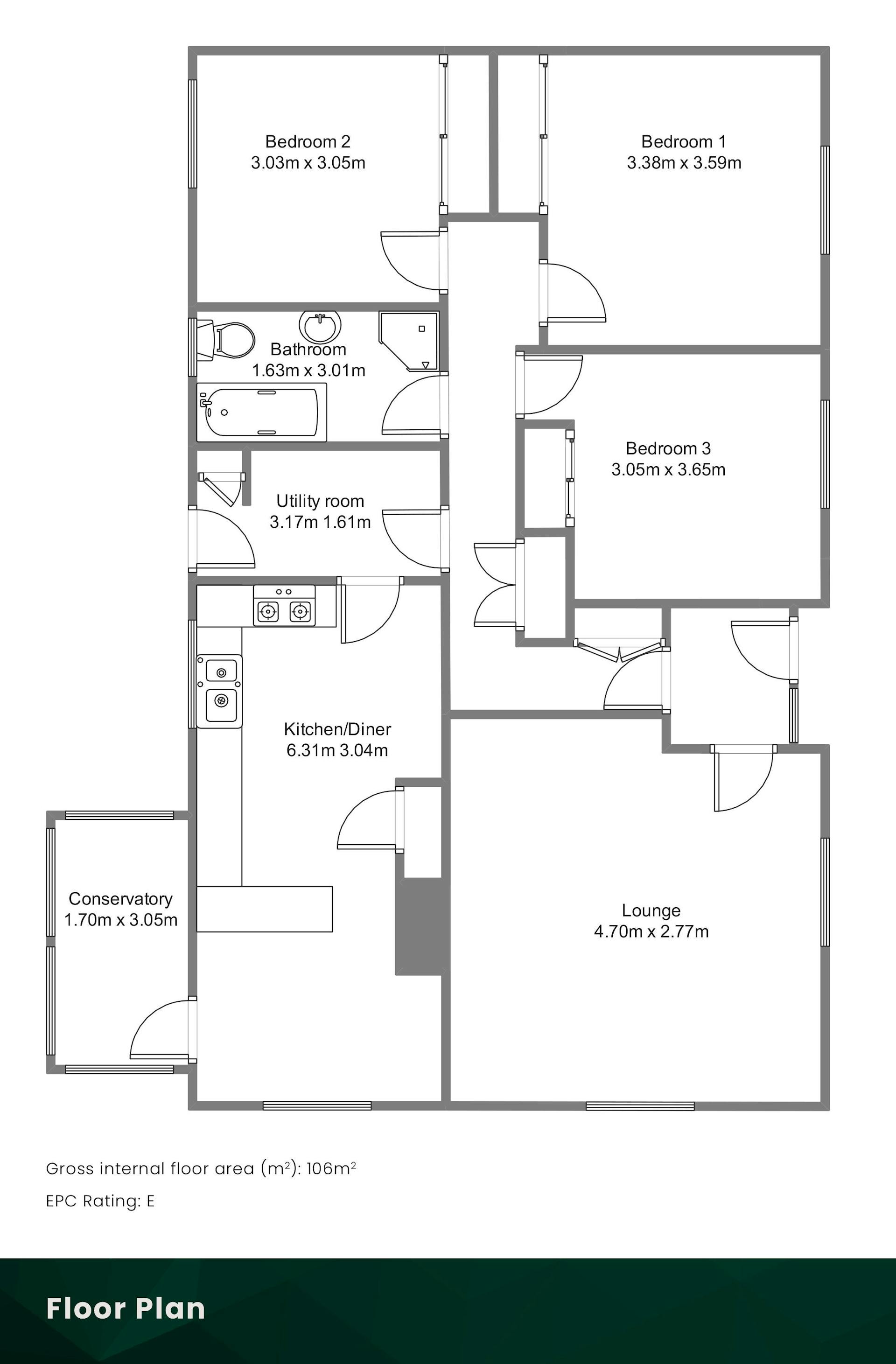 The living room features double aspect windows and an electric fire set in a stone hearth, creating a welcoming focal point. The kitchen and dining area feature a breakfast bar and an integrated oven, while the utility room provides added convenience.