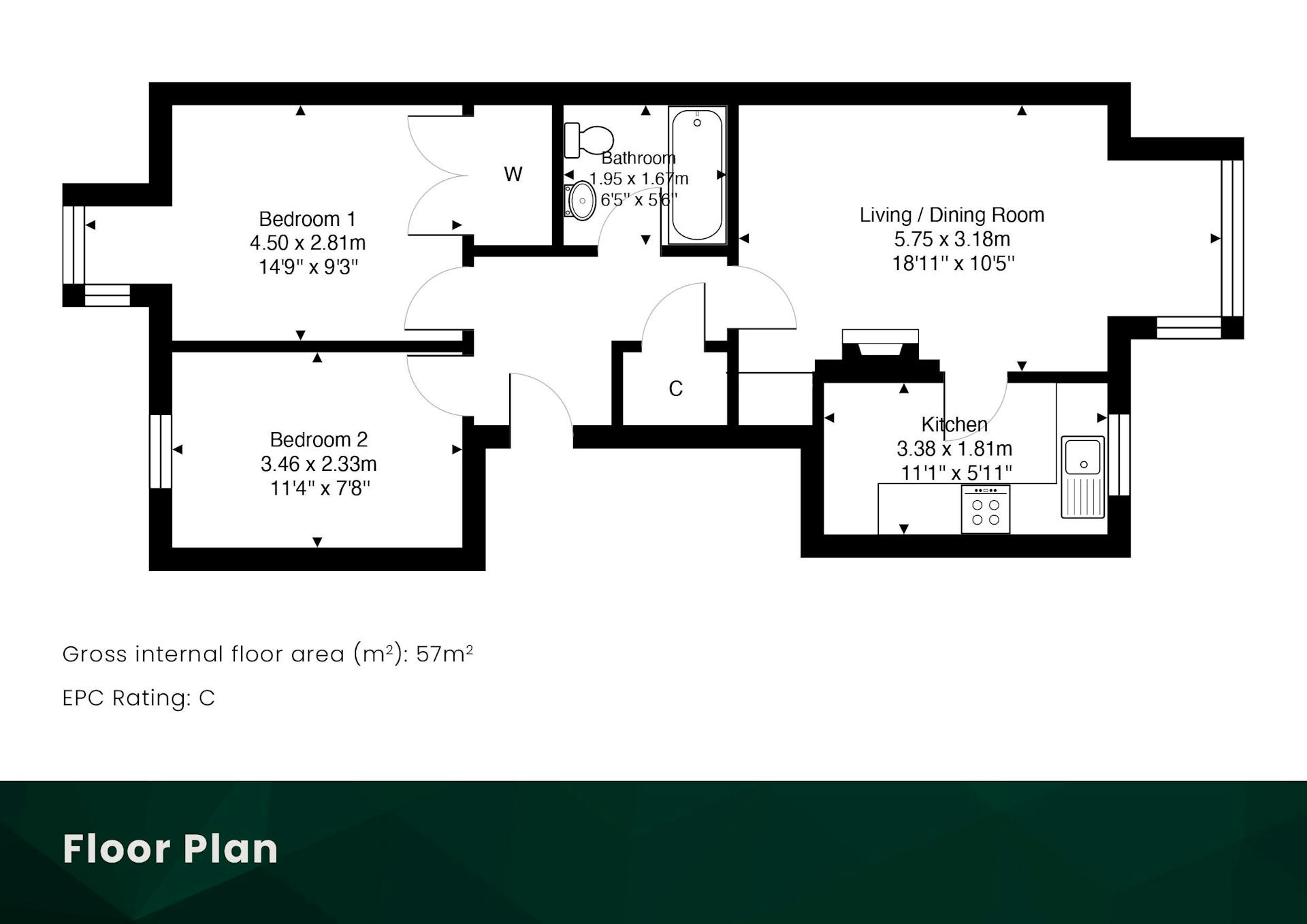 There are two generously sized double bedrooms, one featuring a deep built-in wardrobe and a box bay window. The accommodation is completed by a three-piece bathroom with over-bath shower and glass screen. Further benefits include double glazing and electric heating throughout.