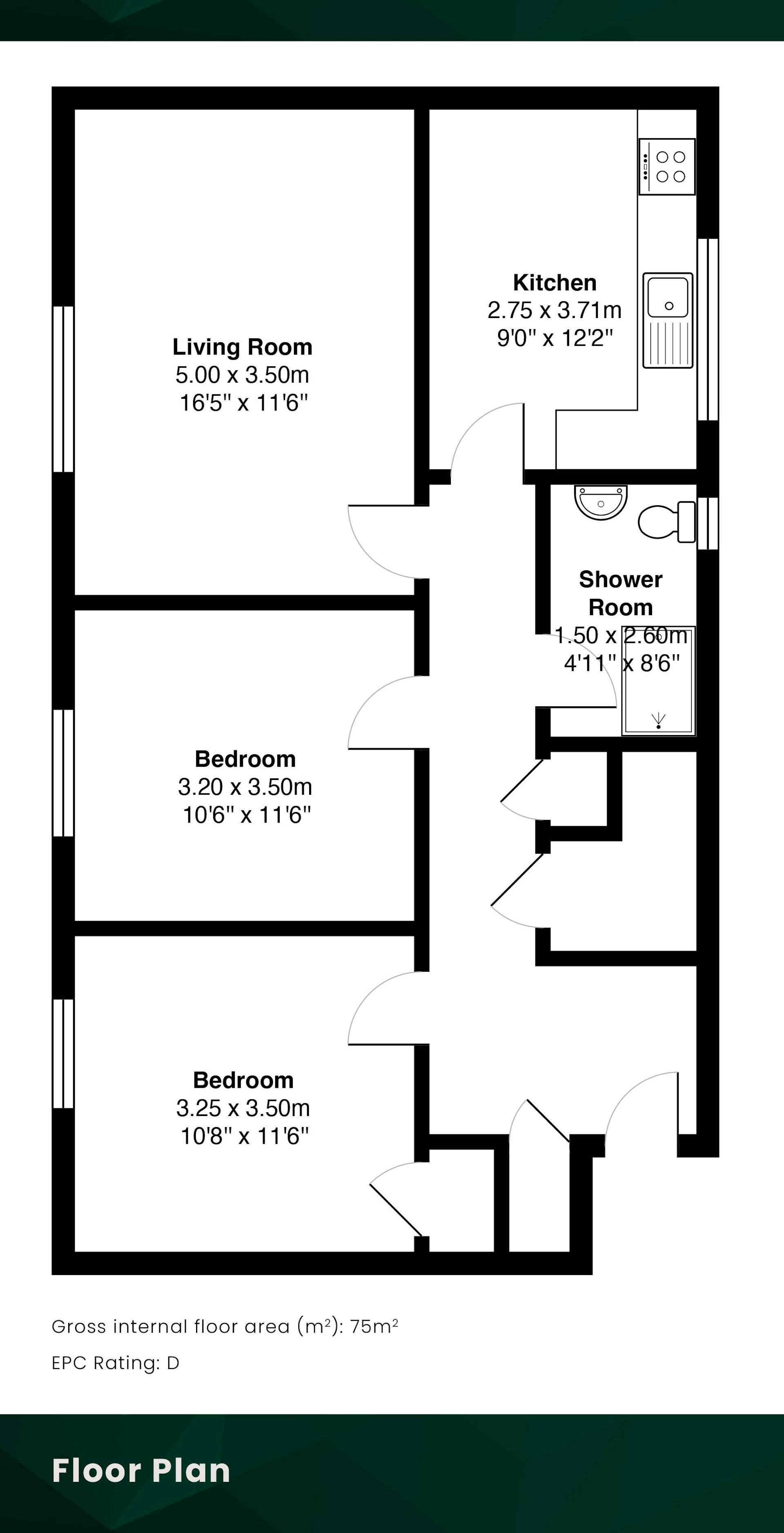 Both bedrooms are well-proportioned and bright, each comfortably accommodating a double bed. The second bedroom also includes built-in storage. The bathroom completes the accommodation and includes a shower, basin and toilet with modern tiling.