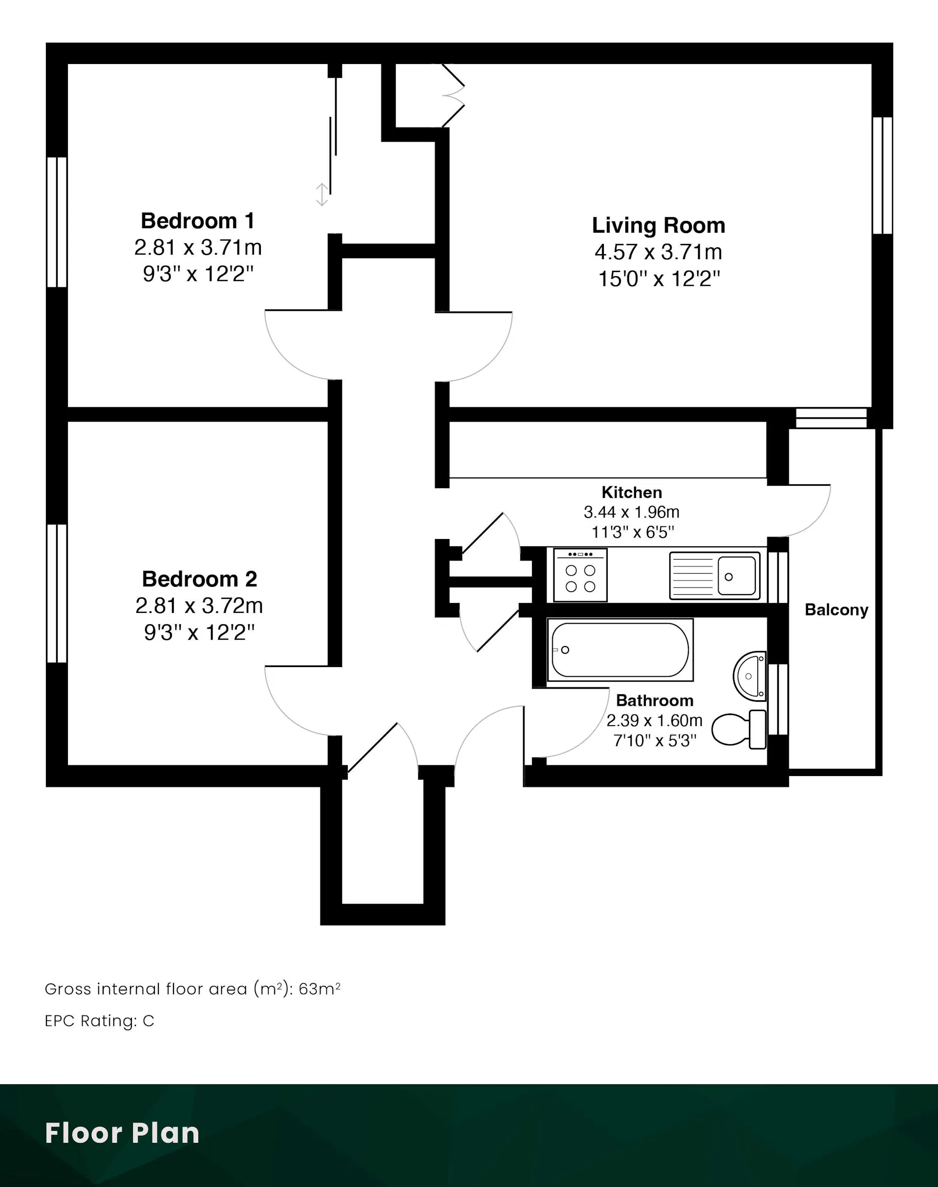 The property opens into a welcoming hallway, thoughtfully styled with neutral décor and useful storage, creating an immediate sense of warmth and home. The generous living room is a standout feature, filled with natural light from large windows and offering ample space for both relaxing and home working, making it perfectly suited to modern lifestyles. The kitchen is well-appointed with a range of fitted units, contrasting worktops and integrated appliances, with direct access to the private balcony.