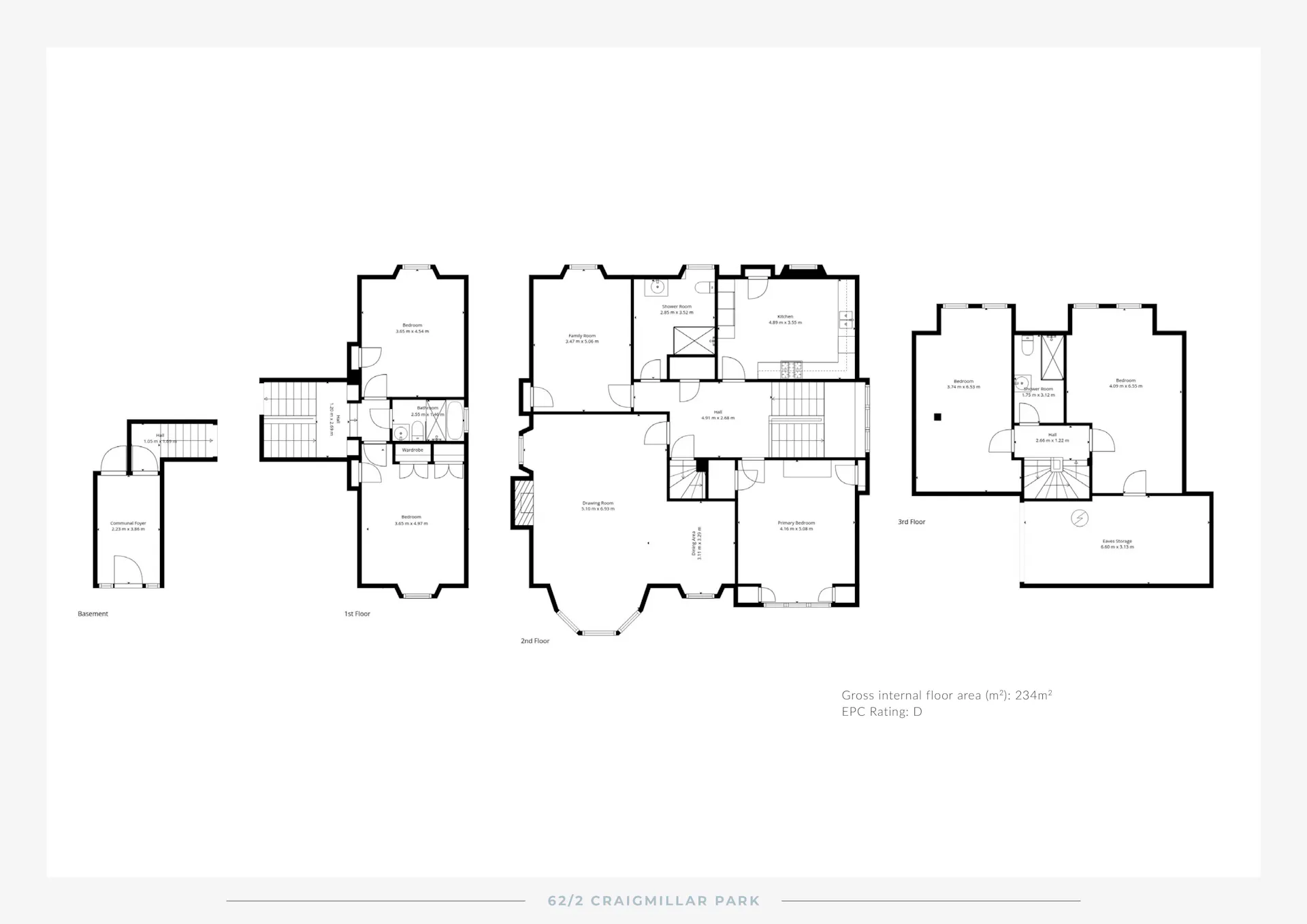 The accommodation continues to the upper level, which forms the heart of the home. Here, a bright and spacious kitchen and family room provide an ideal setting for both everyday living and entertaining. A magnificent drawing room offers an elegant and refined space, enhanced by an intricately detailed ceiling that creates a truly striking focal point. The generous principal bedroom and a stylish bathroom complete this level.