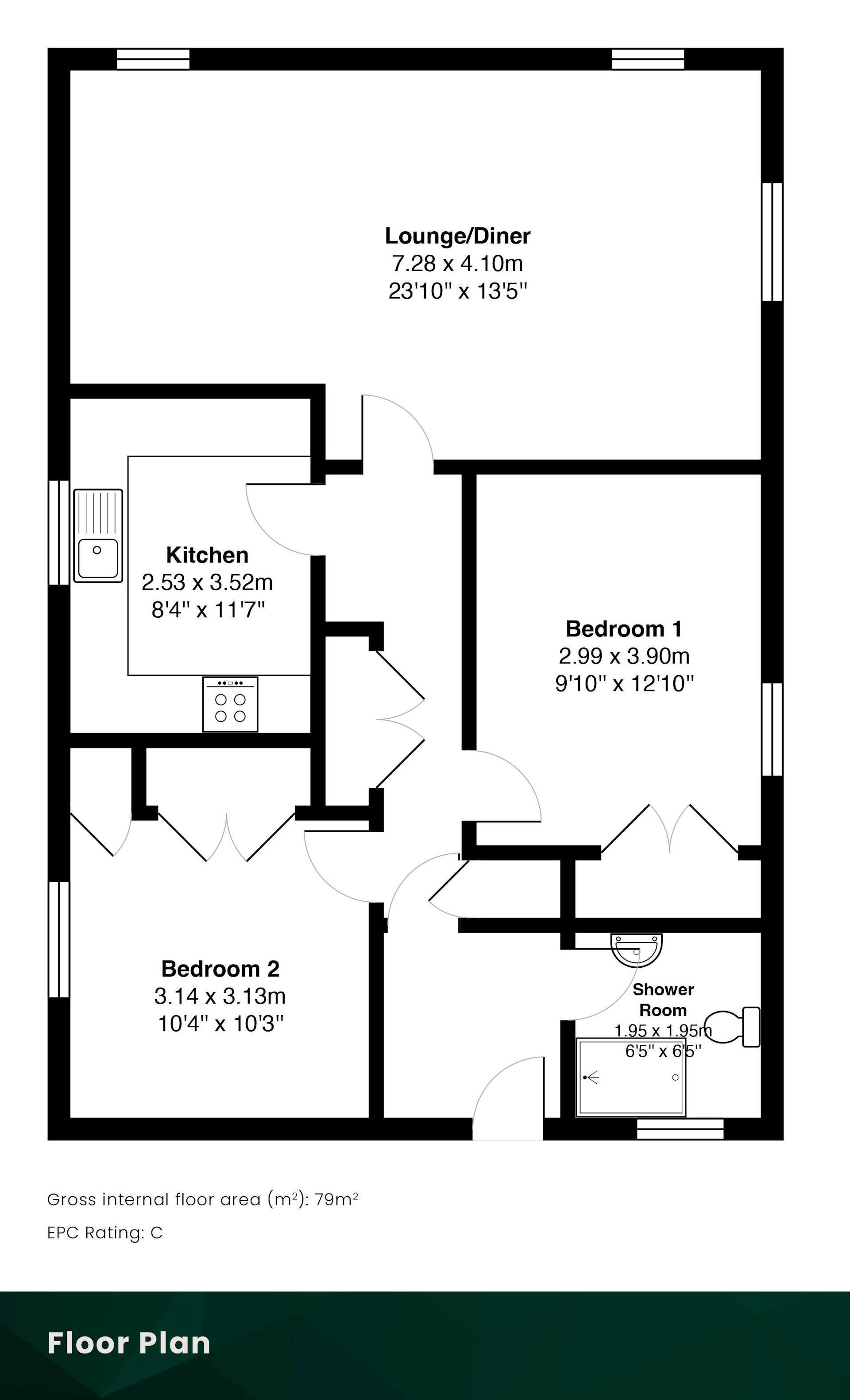 Both bedrooms are well-proportioned doubles, each benefiting from built-in wardrobes and pleasant open outlooks, creating peaceful and relaxing spaces that are well-suited to rest and quiet retreat at the end of the day. The accommodation is completed by a stunning, fully tiled shower room.