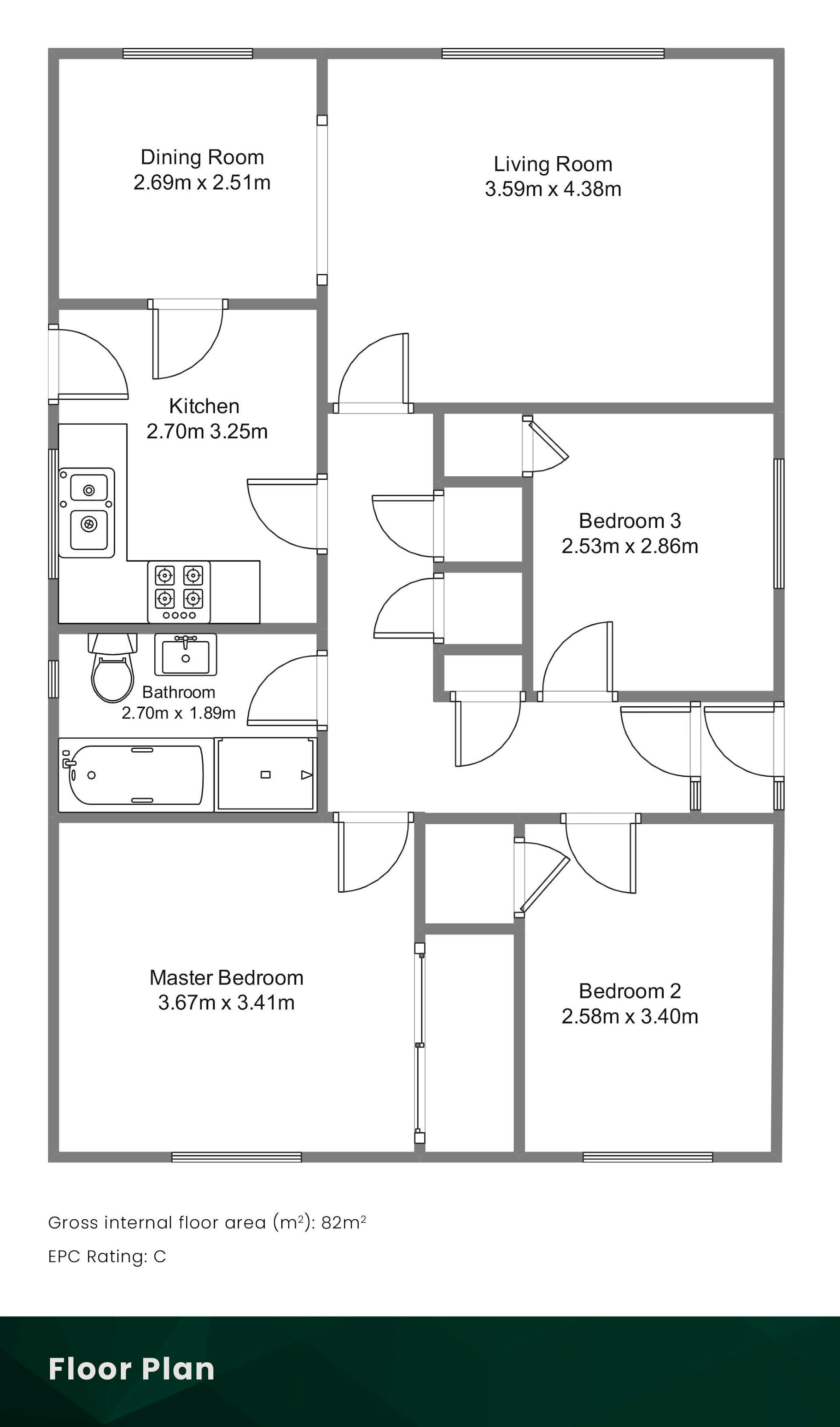 The main living space combines the living room and dining area, giving plenty of room for sofas, a dining table and family life without feeling closed in. It is a space that adapts easily, whether you are relaxing in the evening or having people over. The kitchen has worktop space and is fitted throughout with good quality floor and wall-mounted units. All three bedrooms are comfortable doubles and each includes built-in storage, which makes a real difference for keeping things neat and practical. The bathroom has recently been replaced and has a clean, modern finish.