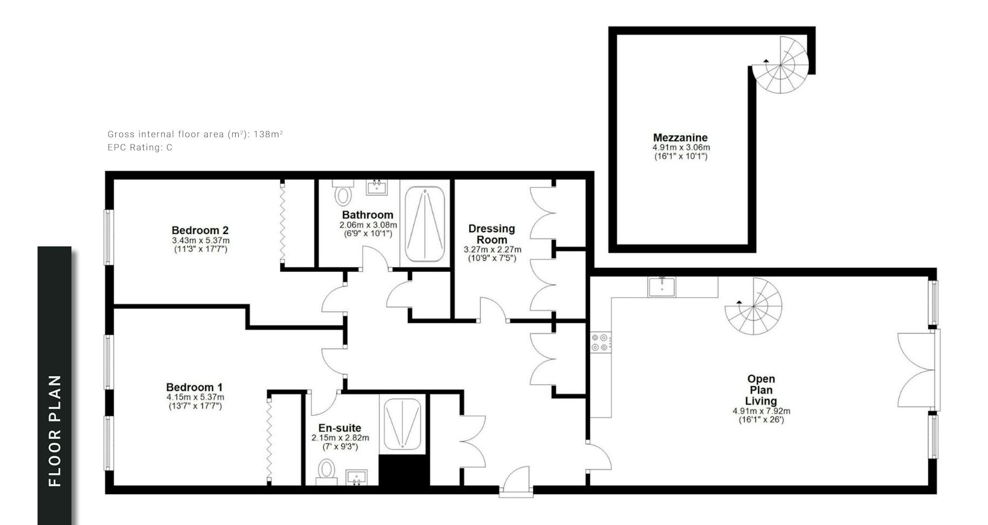 Located on the ground floor, the accommodation comprises two generous double bedrooms, two contemporary bathrooms, a separate dressing room, and the mezzanine office space. Both bedrooms benefit from integrated wardrobes with built-in drawer units and ample floor space for additional furniture.