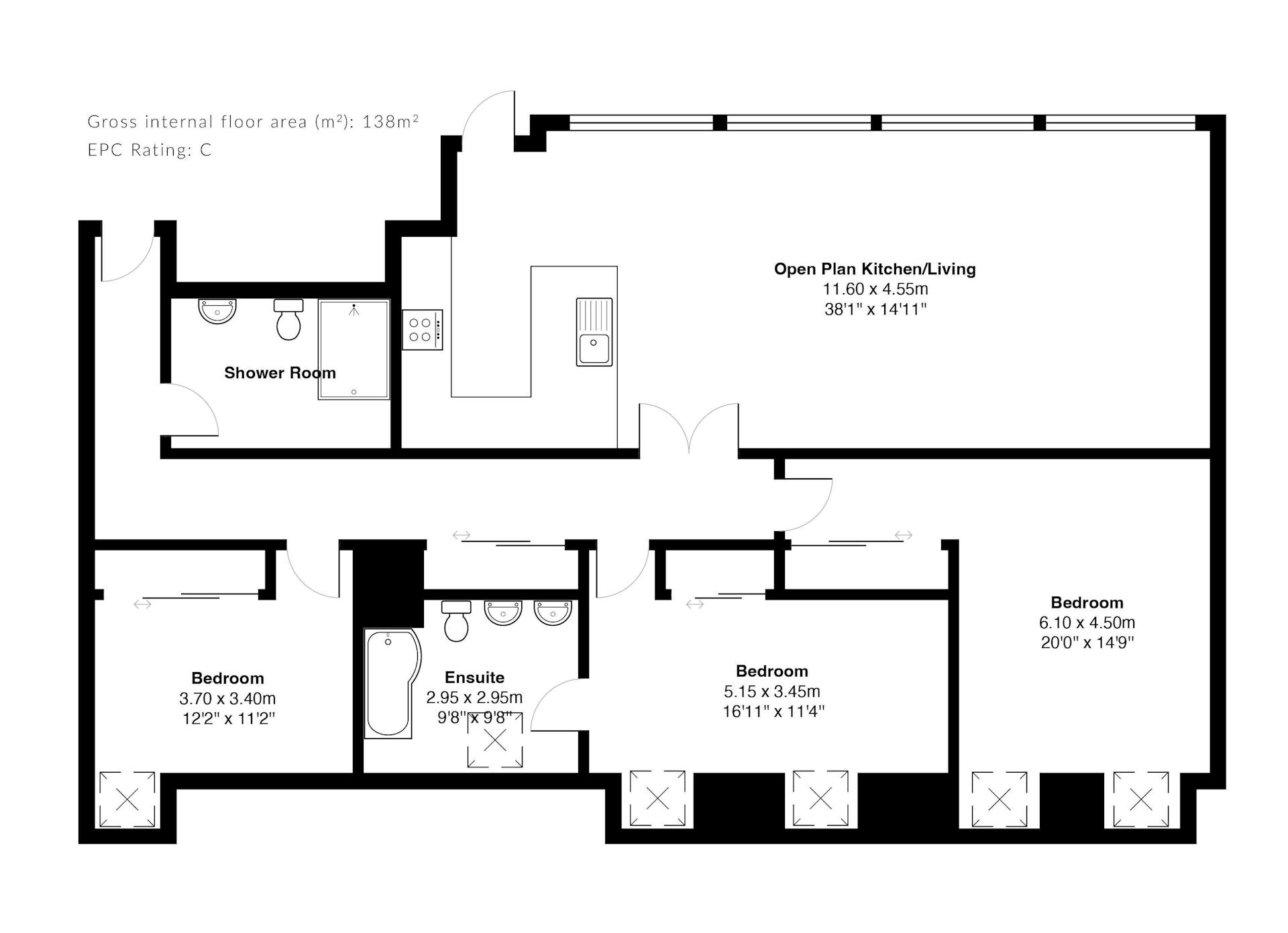 Three incredibly spacious bedrooms, each offering generous proportions, excellent natural light and vistas across Glasgows historic Merchant City skyline. These rooms feel more like suites than bedrooms, big, calm and supremely comfortable. The master bedroom is a sanctuary, large, bright and benefiting from a newly fitted en suite bathroom finished with luxurious tiles and contemporary fittings, a quietly indulgent space to start and end the day.