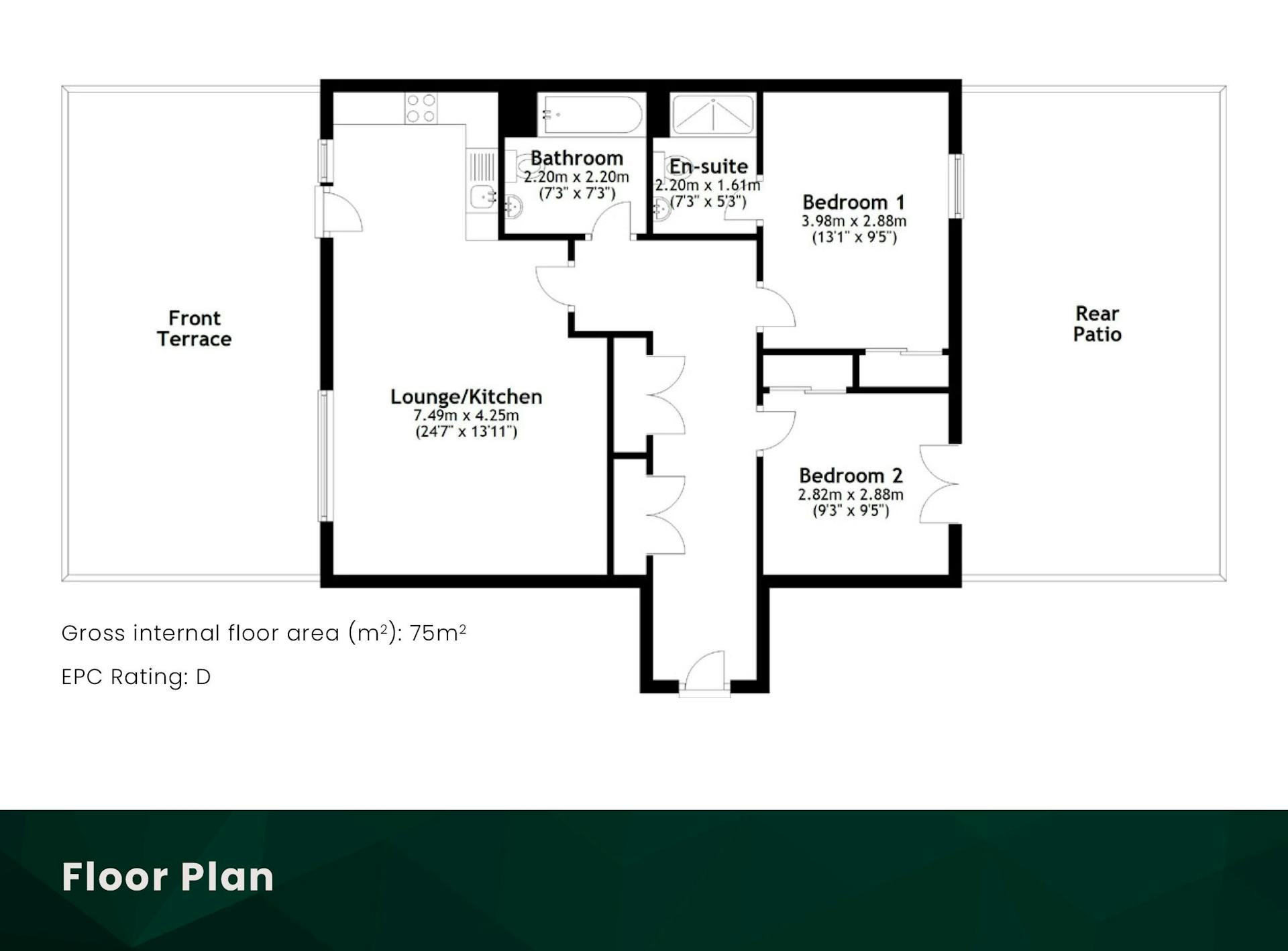 Inside, the property comprises a fully equipped open-plan kitchen/living/dining room. With an electric hob, fan oven, integrated fridge freezer and dishwasher. The space offers an array of possibilities for furniture arrangements and provides access to the private terrace. There are two generous double bedrooms, with the master bedroom benefiting from en-suite facilities and integrated wardrobes in both bedrooms. The main family bathroom is fitted with a modern three-piece bathroom suite.